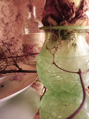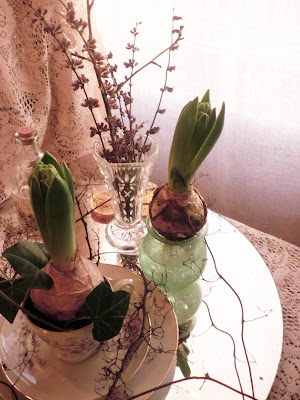 Här satte jag bara hyacinten på vasen med rötterna i vatten för det har jag sett i en tidning. Jag har i och för sig hört att hyacinter inte ska ha så mycket vatten så jag vet inte hur det här kommer funka men det visar sig!