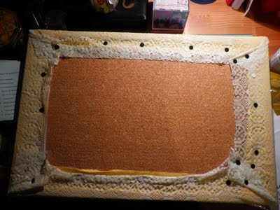 Jag köpte en anslagstavla på en andra hands-affär. Dom ser ju bra tråkiga ut så då är väl det enda rätta att göra nåt åt det. Anslagstavelinklädningsdags alltså.