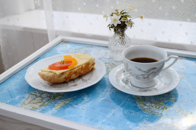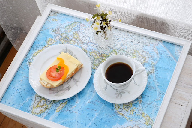 Ramen målade jag först i en ganska ful rosa färg men ändrade mig kvickt. Vitt är ju ändå det som funkar i längden! Sen ska man ha något skönt motiv på brickan, kanske ett snyggt tyg, en bild eller många. Jag gillar ju kartor ganska mycket så det fick det bli!