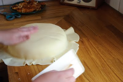 Tårtorna täcktes med marsipan och till det användes en smoother så att det ska bli slätt.