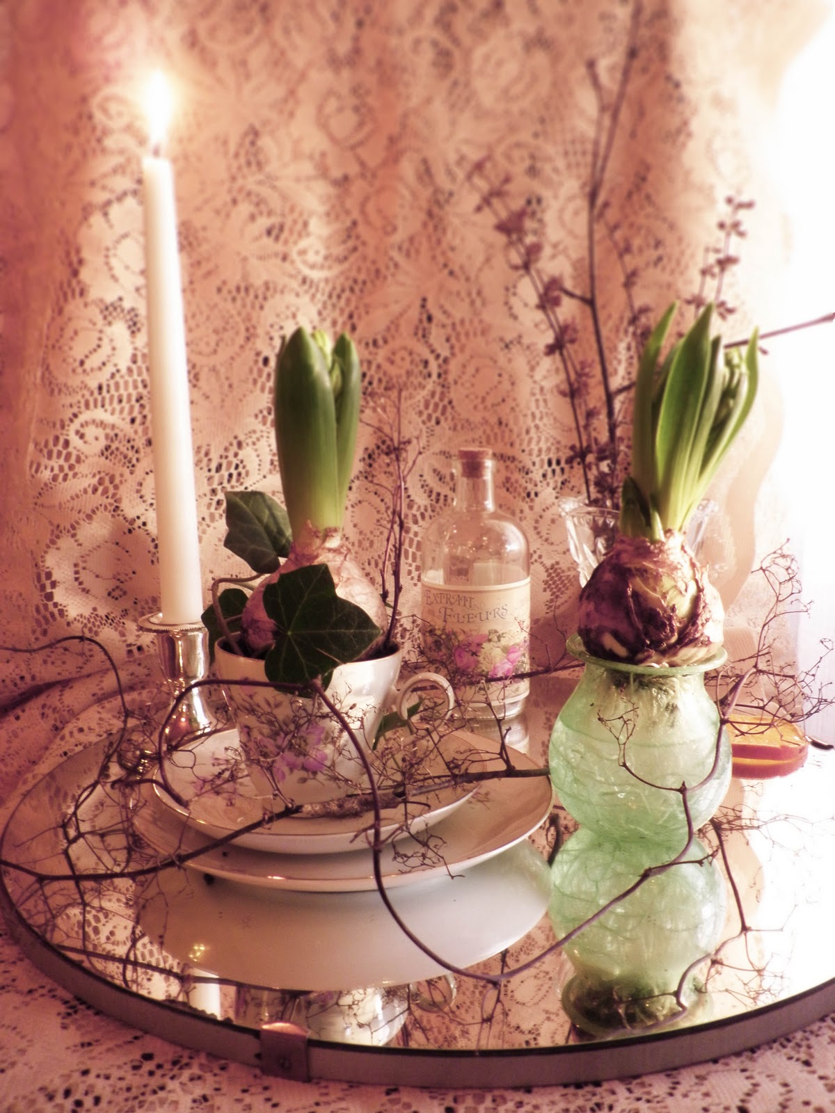 Ljusrosa och vit lupin, daggkåpa och hundkäx (eller liknande) stod i små glasburkar, flaskor och vaser på borden. På just det här bordet fick de stå på den flitigt använda spegeln.