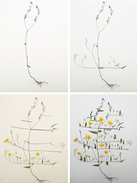 Jag började med en blomma med lång stjälk och rot på. För att sätta fast växterna använde jag mig av ett helt vanligt lim som jag penslade på baksidan av blomman och tryckte fast. Sen la jag ”grenar” åt båda håll och byggde på med blommor, små kvistar och ormbunksblad.