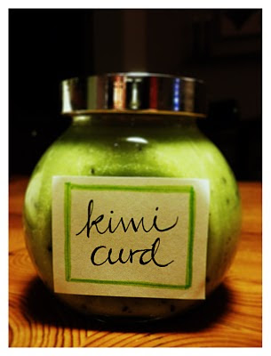 Hacka 3 kiwis och koka upp i en kastrull med 1 dl socker (ev.är det för mycket socker) och knappt 50g smör. Mixa med stavmixer eller liknande om du vill ha en helt slät curd (min blev inte slät så det finns inga garantier). Blanda ut drygt en halv matsked maizena i 2-3 matskedar citronsaft (alla tv-kockar bannlyser plastcitron men jag tog det ändå 🙂 och släng med i kiwigrejen. Blanda, koka lite till och häll i en skål över ett vattenbad. Vispa upp två (små) ägg och blanda i kiwismeten. Nu måste man röra hela tiden och det får inte koka, efter ett tag är det klart. Även om den kanske inte verkar så ”curdig” i konsistensen så blir den bättre när den svalnat (hoppas jag). Häll upp i väl rengjorda burkar och sätt en snygg etikett på. Curd har inte så lång hållbarhet, kanske två veckor i kylskåp så ät fort, fast det är inte så svårt eftersom det inte blir så mycket curd av just det här receptet, typ en liten burk bara..