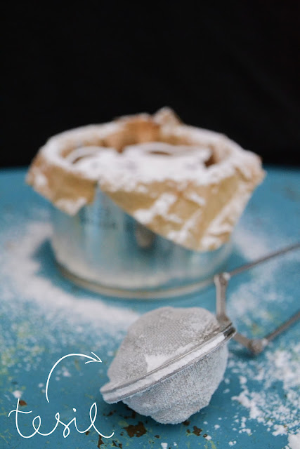 När man tagit ut kakan och den svalnat så kan man pudra florsocker över med exempelvis en tesil.