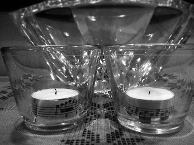 Värmeljus ser inte alltid jätteroliga ut. Har man dem i en ljuslykta där de inte syns spelar det ju ingen roll men har man genomskinliga glaslyktor kan man faktiskt klistra på nåt festligt papper, kanske noter. Man kan också skriva några väl valda ord i ett ordbehandlingsprogram (eller för hand), skriva ut och klistra på.